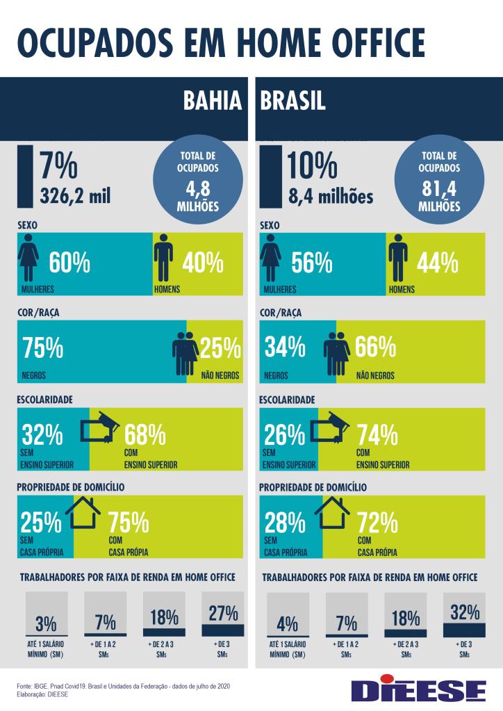 Observando os números compilados pelo DIEESE (infográfico acima) percebemos que não é bem assim: na Bahia apenas 7% dos trabalhadores ocupados encontram-se trabalhando em casa. Mais ainda: observando os dados e verificando os setores que ainda não retomaram suas atividades podemos concluir com boa dose de certeza que o “home office” esta concentrado no setor da educação.