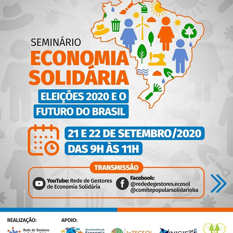 A Rede de Gestores de Políticas Públicas de Economia Solidária promove o Seminário “Economia Solidária, Eleições 2020 e o Futuro do Brasil” nos dias 21 e 22 de setembro das 9 às 11 horas.