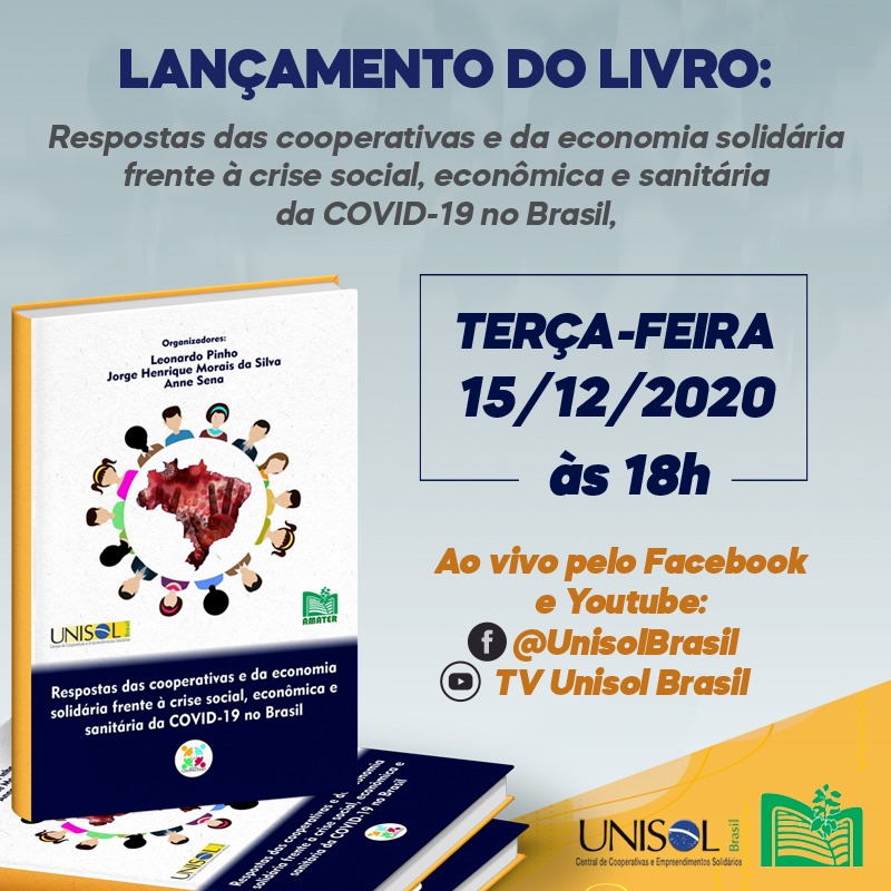 “Alternativas para obter trabalho e renda e ajudar ao próximo nessa época de quarentena e de crise econômica. Esse é o tema do livro Respostas das cooperativas e da economia solidária frente à crise social, econômica e sanitária da COVID-19 no Brasil, que será lançado pela Unisol em parceria com a Amater Cooperativa no dia 15/12 (terça-feira), às 18h.
