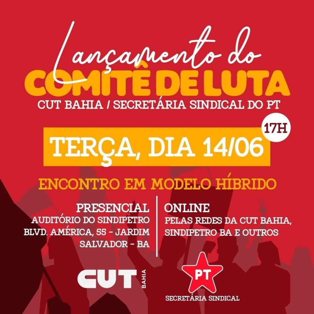 Amanhã (14) às 17h acontece o lançamento do Comitê de Luta da CUT Bahia junto com a Secretaria Sindical do PT estadual.