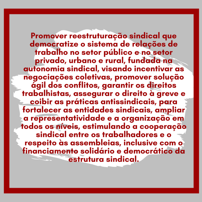 Por fim, e provavelmente o ponto mais polêmico, uma proposta ainda bastante genérica sobre a criação de um sistema democrático de relações de trabalho, enunciado em apenas uma, emboar longa, frase : “Promover reestruturação sindical que democratize o sistema de relações de trabalho no setor público e no setor privado, urbano e rural, fundada na autonomia sindical, visando incentivar as negociações coletivas, promover solução ágil dos conflitos, garantir os direitos trabalhistas, assegurar o direito à