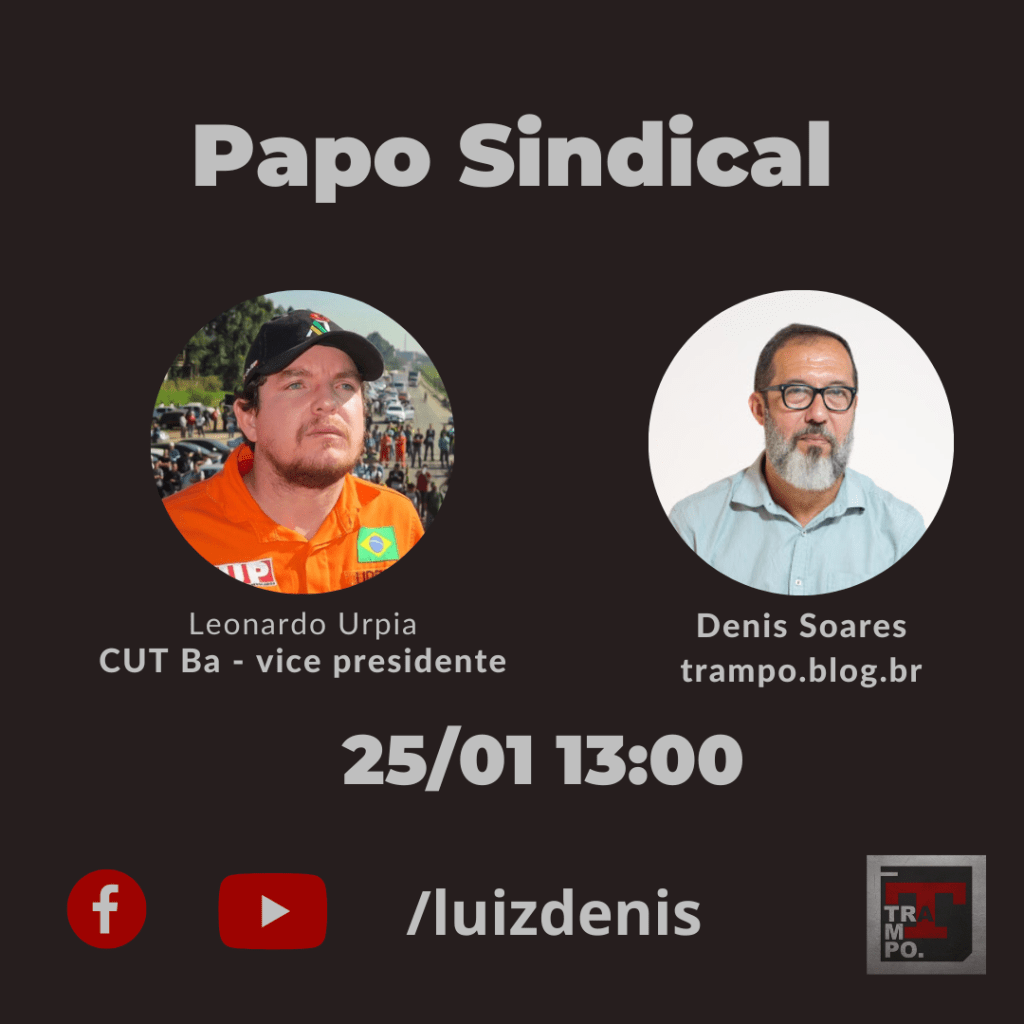 E o próximo entrevistado do Papo Sindical é o companheiro Leonardo Urpia, dirigente do Sindpetro Ba e vice presidente da CUT Ba. Nesta quarta, 25 de janeiro às 13 horas, nos nossos canais no YouTube e Facebook. Aproveite o momento para seguir nossos canais e acompanhar a nossa programação.