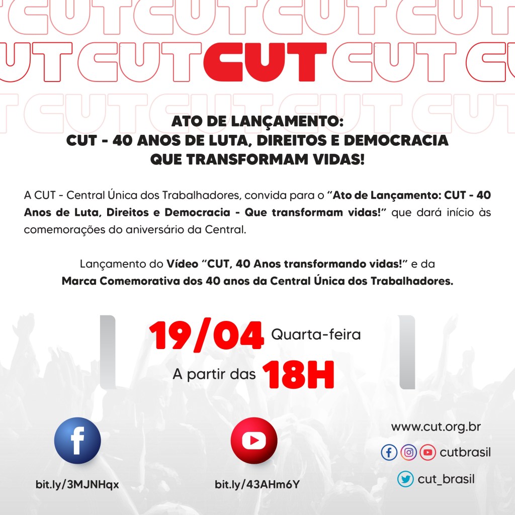 Sem muito alarde (não entendo bem as razões) a CUT – Central Única dos Trabalhadores – realiza hoje, 19 de abril às 18 horas, ato de lançamento das atividades comemorativas alusivas ao aniversário da central sindical com o lema “CUT – 40 anos de luta, direitos e democracia que transformam vidas”.