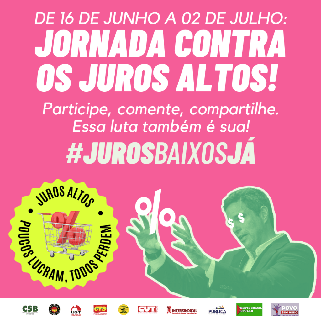 A partir desta sexta feira, 16 de junho, as centrais sindicais, partidos de esquerda e as frentes Brasil Popular e Povo sem Medo estarão em campanha contra a politica de juros altos do Banco Central. Atividades de rua acontecem amanhã, lançamento da campanha, e no dia 20 de junho, data em que o COPOM – Comitê de Política Monetária do Banco Central se reúne em Brasília.