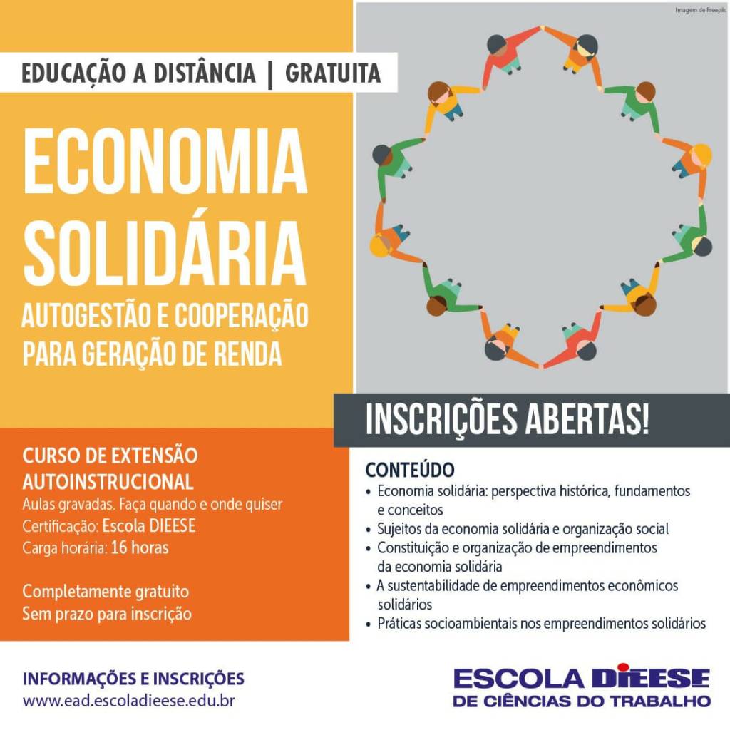 O DIEESE e a Escola DIEESE estão com inscrições abertas para o curso on-line gratuito Economia solidária: autogestão e cooperação para geração de renda. O conteúdo é completamente virtual e foi desenvolvido com o objetivo de disponibilizar conhecimento sobre práticas de economia solidária. As aulas são gravadas, o que permite acessar o material quando e onde quiser.