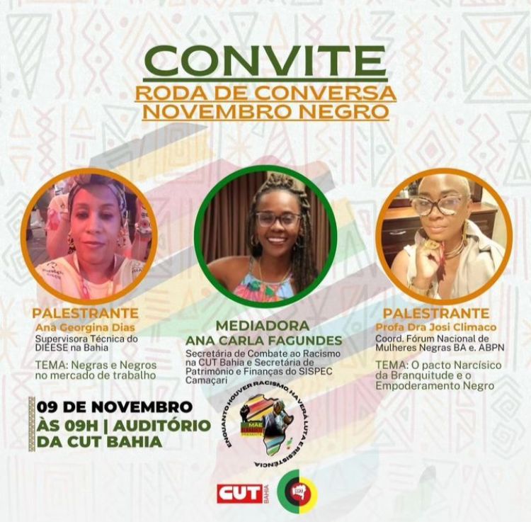 Nesta quinta a CUT abre as portas da sua sede em Salvador pra uma roda de conversa por conta do Novembro Negro e a questão do negro no mercado de trabalho estará em pauta : Ana Georgina, Supervisora do DIEESE Ba e Josi Clímaco pelo Forum Nacional de Mulheres Negras estarão abordando este e outros temas.
