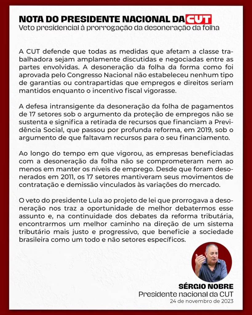 A CUT publicou nota (ver abaixo) defendendo o veto com o argumento de que não existem dados objetivos evidenciando que a desoneração gera mais empregos (leia mais aqui). Apesar de ameaçar com demissões e precarização as entidades empresariais não apresentam evidências fáticas de quantos empregos foram gerados ou quantos serão destruídos.