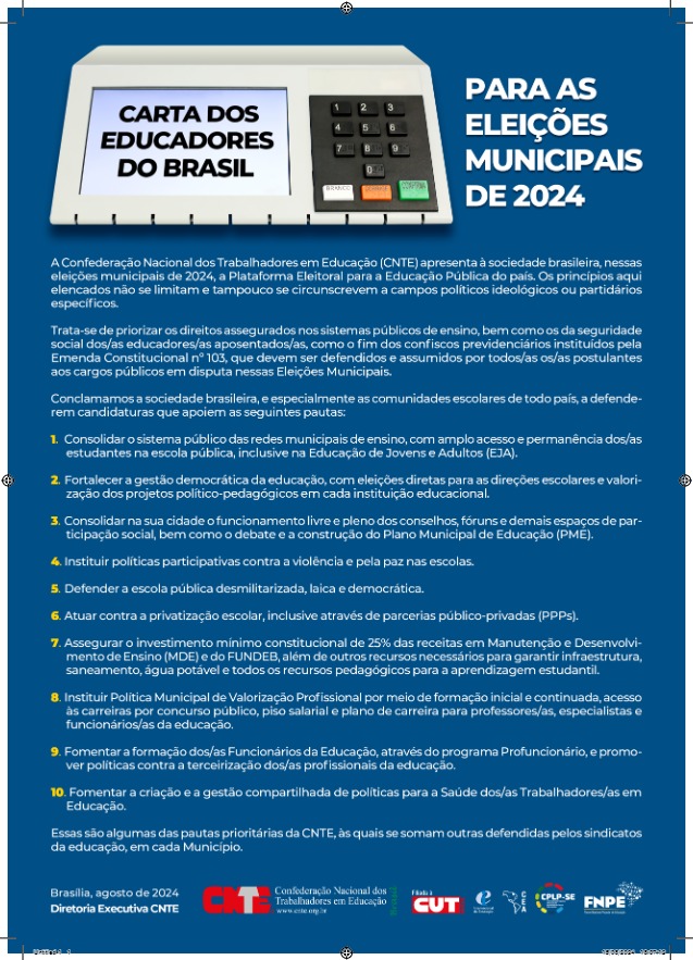 Documento produzido pela CNTE – Confederação Nacional dos Trabalhadores da Educação – com propostas para candidatos a prefeito ou vereador, independendo de coloração partidária. Fico a me perguntar qual o nível de adesão pública de candidatos.