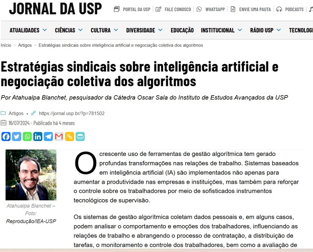 A aula funcionou como um momento de alinhamento conceitual e trouxe uma contribuição muito boa : o artigo escrito pelo palestrante e publicado no Jornal da USP (leia aqui) sobre a ação sindical no enfrentamento dos impactos causados pelas IA.