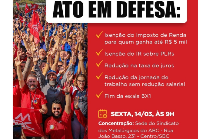 Neste 14 de março, sexta feira, o Sindicato dos Metalúrgicos do ABC promovem ato em defesa das pautas da classe trabalhadora (saiba mais clicando aqui). A pauta em questão (ver detalhes no card) está em perfeito alinhamento com as demandas da classe trabalhadora como um todo e a manifestação pretende chamar a atenção do próprio movimento sindical, população e deputados e senadores.