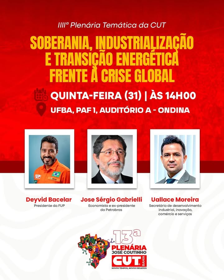 Continuando (e concluindo) a série de debates preparatórios para a sua plenária estatutária a se realizar em agosto a CUT Ba promove debate sobre industrialização e transição energética. Debate oportuno por conta da retomada de processso de industrialização no Brasil em meio a uma conjuntura mundial conturbada. Também no momento em que o Governo da Bahia inicia a elaboração do seu Plano de Desenvolvimento Integrado – PDI 2050 (leia aqui) e prepara-se para a construção da sua Política Industrial.