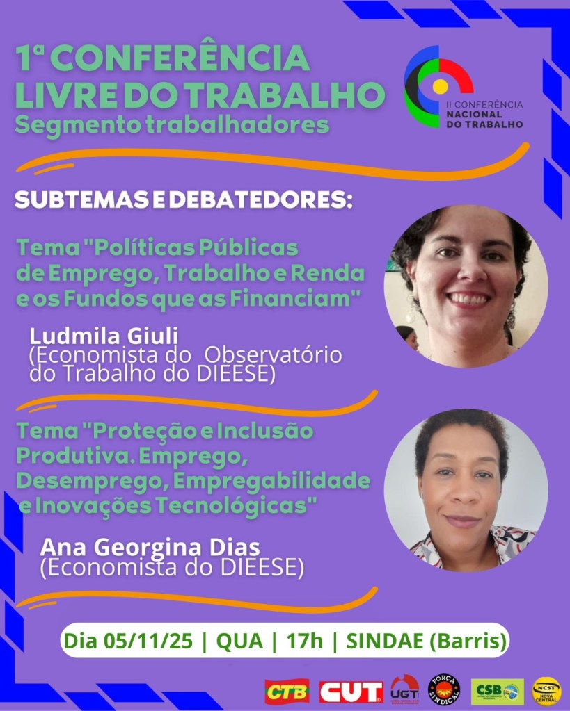 O Governo Federal através do Ministério do Trabalho e Emprego realiza a II Conferencia Nacional do Trabalho. A etapa nacional acontece em março de 2026 em Brasília e a etapa estadual será no dia 28 de novembro. O site da II Conferencia é repleto de informações e pode ser acessado clicando aqui. E para entender as formas e critérios de participação acompanhe a entrevista que realizamos com Gilene Pinheiro, representante da CUT na Comissão Organizadora da etapa baiana.